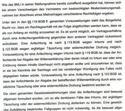 Dazu muss ich anführen, dass ich sofort als ich kurz nach meinem Einzug erfahren habe durch die angekündigte Arbeiten im Keller, dass man mir wie schon erwähnt eine umfangreiche Baumaßnahme verschwiegen hat mich auf §119 BGB berufen habe und ich habe dem Leistungsträger andere Wohnungsangebote anderer Vermieter vorgelegt.Natürlich sah der Leistungsträger SGB II natürlich keinen wichtigen Grund in der verschwiegenen Baumaßnahme und das obwohl das Bundesjustizministerium in einer Petitionsantwort schrieb: