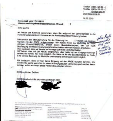 auch eine Eingabe in der Hamburger Bürgerschaft gemacht, da es sich bei der GWG um einen kommunalen Laden handelte, in dessen Aufsichtsrat ja der Hamburger Senat vertreten war. Die Antwort zu der Eingabe 166/09 lief noch, als die GWG mir die erwähnten Angebote machte.Und die Eingabe lief auch noch als ich genötigt war, weil ein Umzug der in eine GWG Wohnung notwendig war, außerhalb dieser nicht notwendig war, eine Vereinbarung am 14.10.2010 über den Ablauf von umfangreichen Arbeiten wegen Schimmel und wegen der arglistig verschwiegene Baumaßnahme zu treffen.